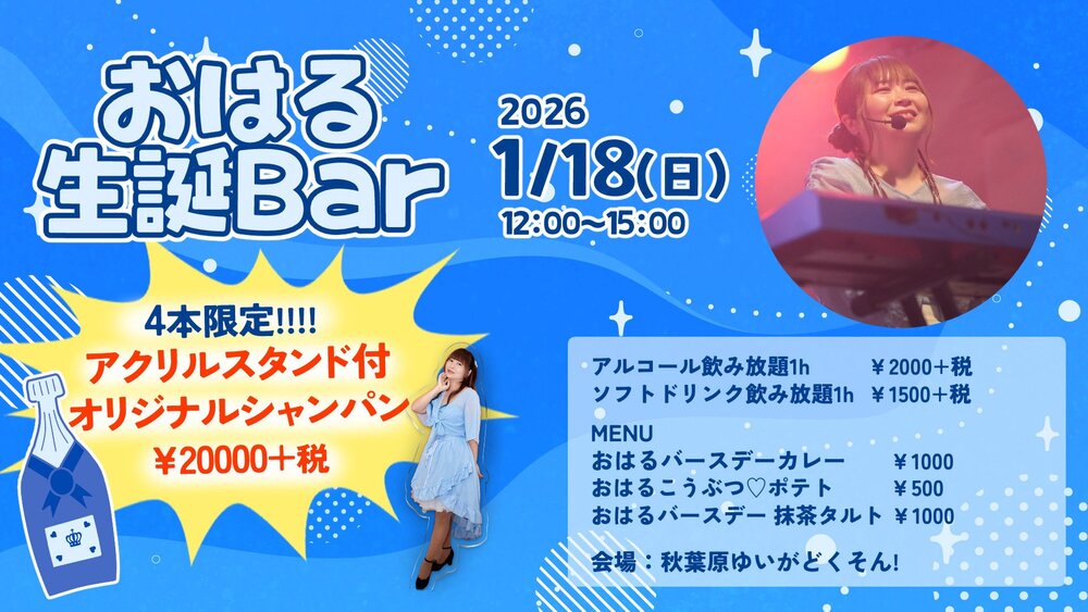Key.おはる 生誕BAR LIVE 2026/01/18(日) 12:00 - 秋葉原ゆいがどくそん! 2026年1月18日(日) 時間▶︎ 12:00〜15:00場所▶︎ 秋葉原ゆいがどくそん!料金▶︎飲み放題 1h 2000円+税 ※ソフトドリンクの場合 1h 1500円+税 アクスタ付オリジナルシャンパン有🥂みんなでお祝いしよう🕊️✨ URLをコピーする 報告する