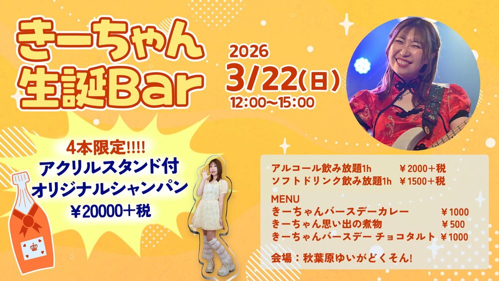 Gt.&Vo.きーちゃん生誕Bar LIVE 2026/03/22(日) 12:00 - 秋葉原ゆいがどくそん! ✨\\Gt.&Vo.きーちゃんの 生誕BAR開催//✨ 2026年3月22日(日) 時間▶︎ 12:00〜15:00場所▶︎ 秋葉原ゆいがどくそん!料金▶︎飲み放題 1h 2000円+税 ※ソフトドリンクの場合 1h 1500円+税 アクスタ付オリジナルシャンパン有🥂みんなでお祝いしよう🕊️✨ URLをコピーする 報告する